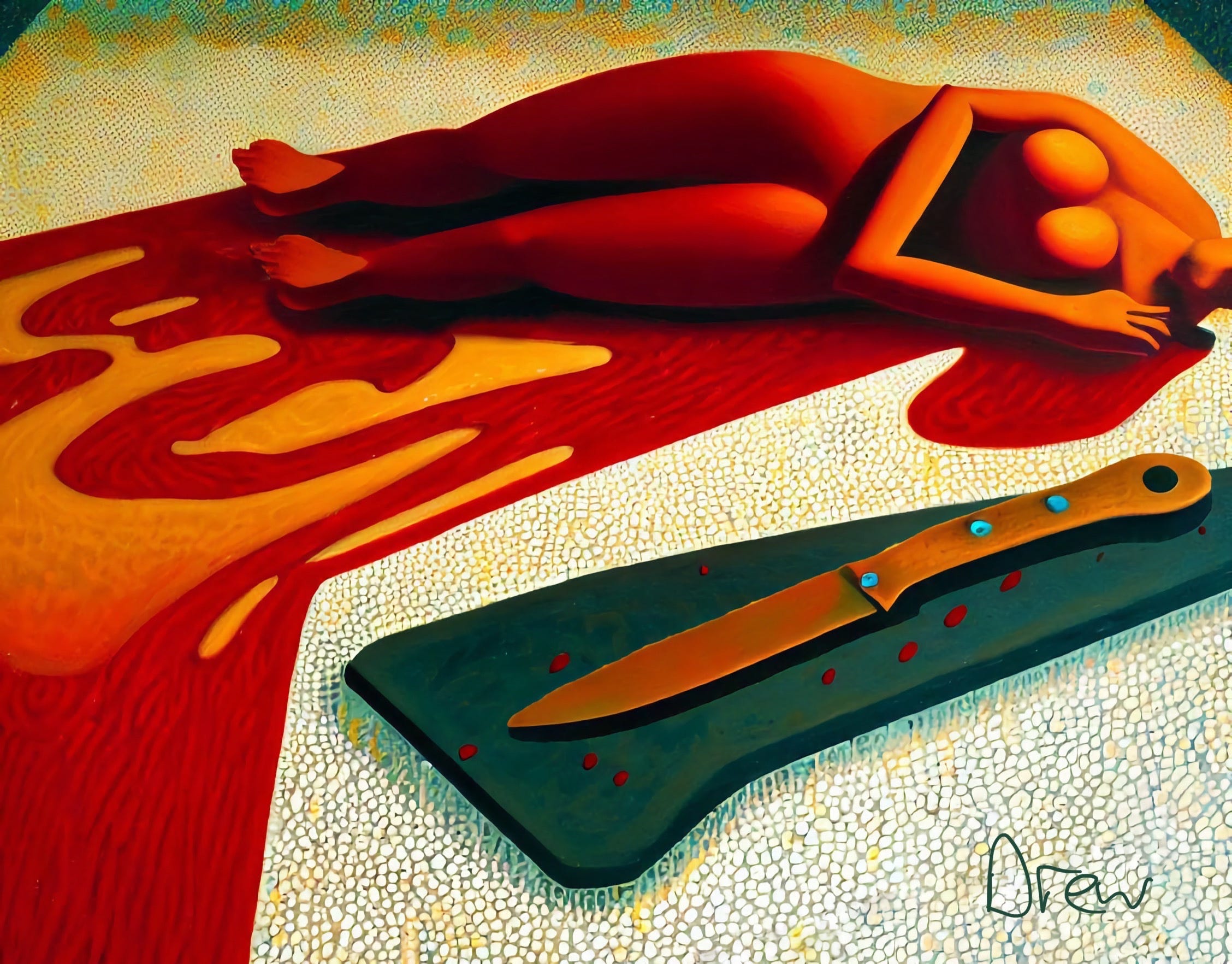 An agonised spasm wracks her fine frame, delicate as a dandelion, fragile as a butterfly, her small head haloed by a crimson coronet.