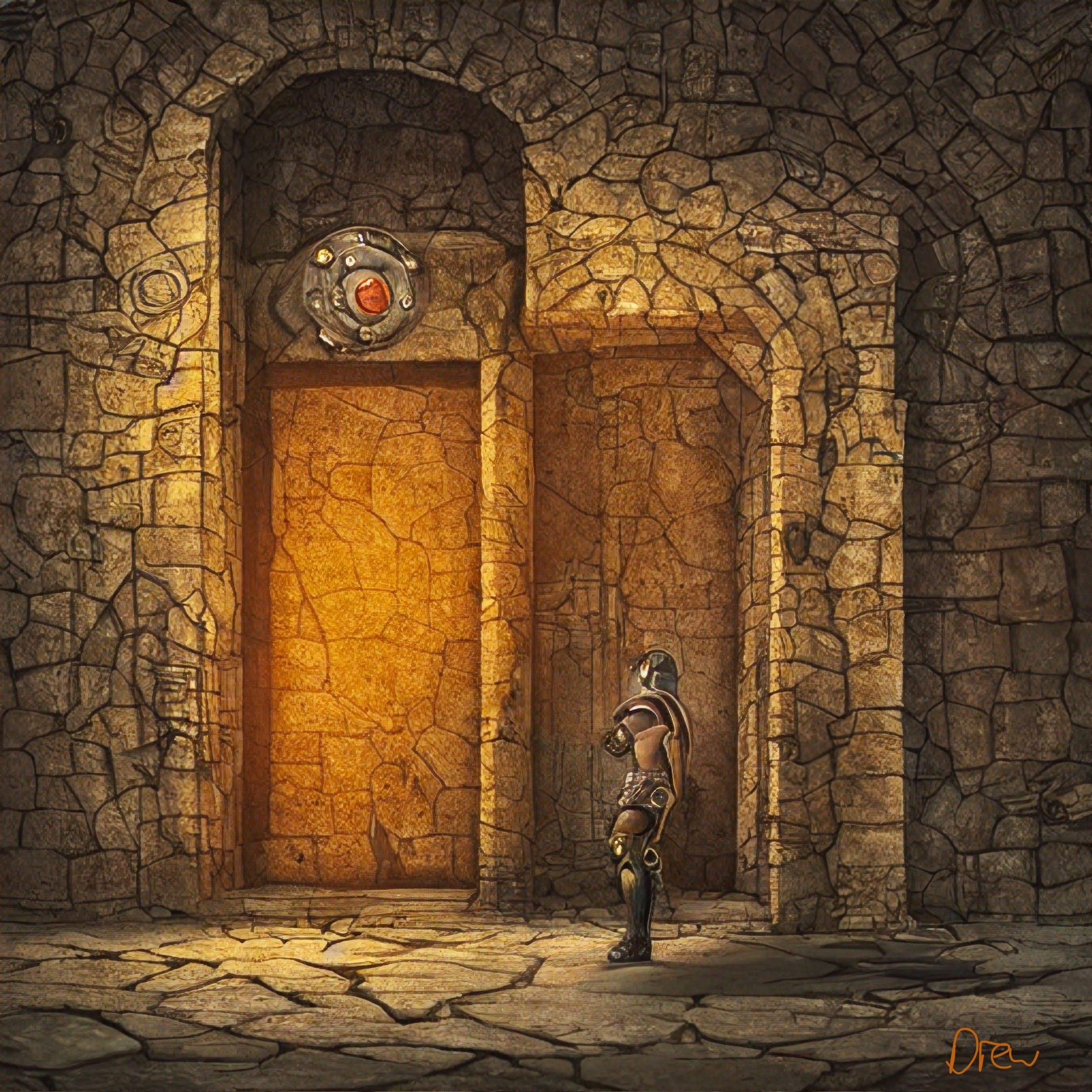 A tribesman confronts a sentient door in an ancient maze designed for death.